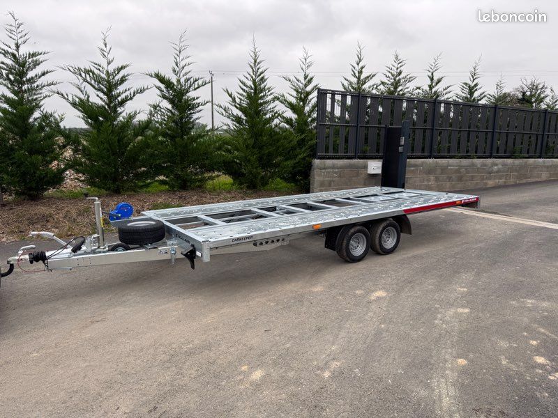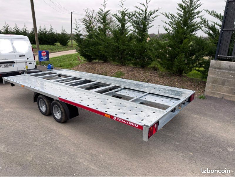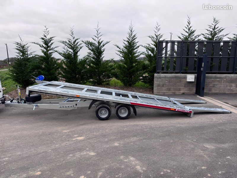 Remorque porte-voiture neuve Temared, conçue pour le transport de véhicules et engins. Angle d'inclinaison faible (6°), parfait pour charger les voitures à suspension basse. Rampes rétractables sous le plateau.