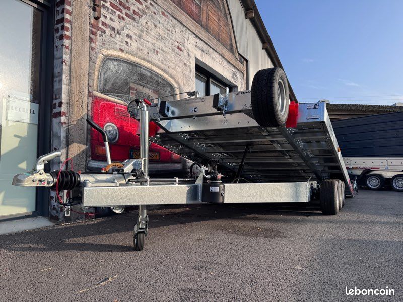 Remorque porte-voiture neuve Temared, conçue pour le transport de véhicules ou d'engins. Basculement hydraulique avec angle faible (11°), idéal pour charger les voitures à suspension basse.