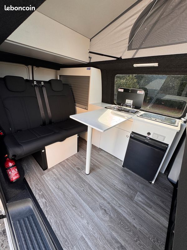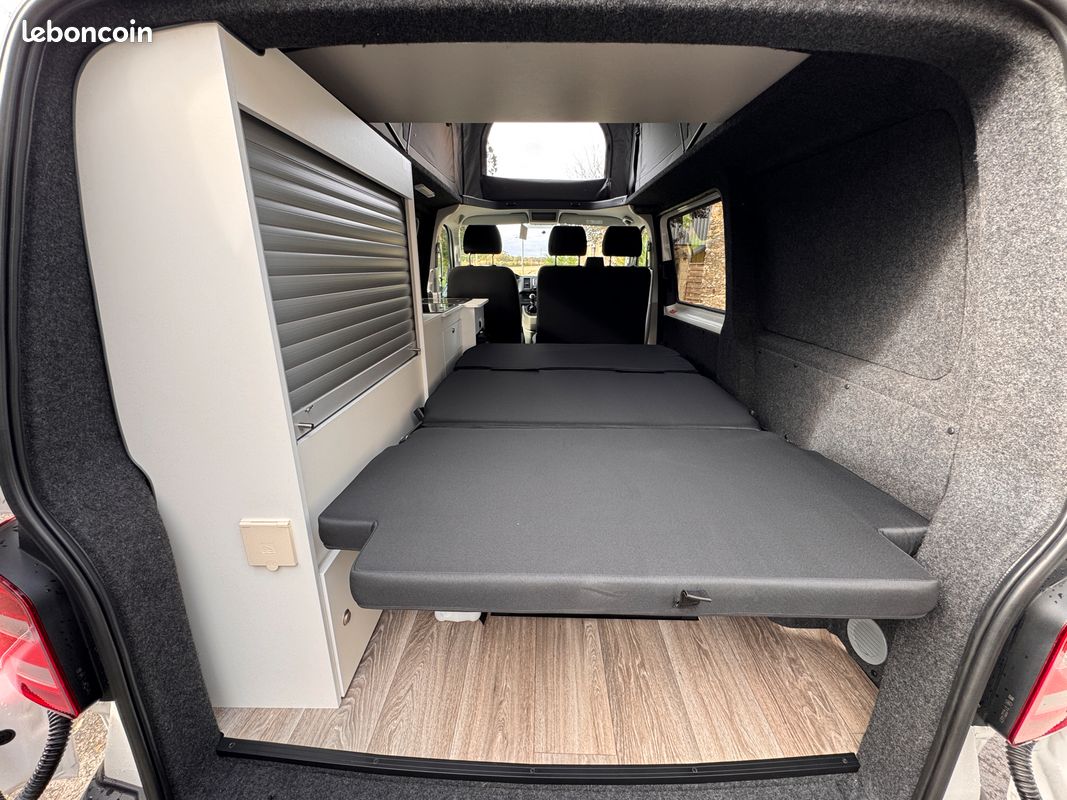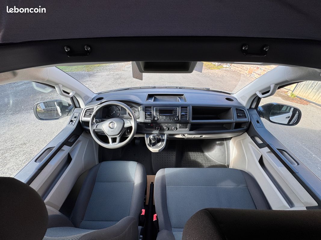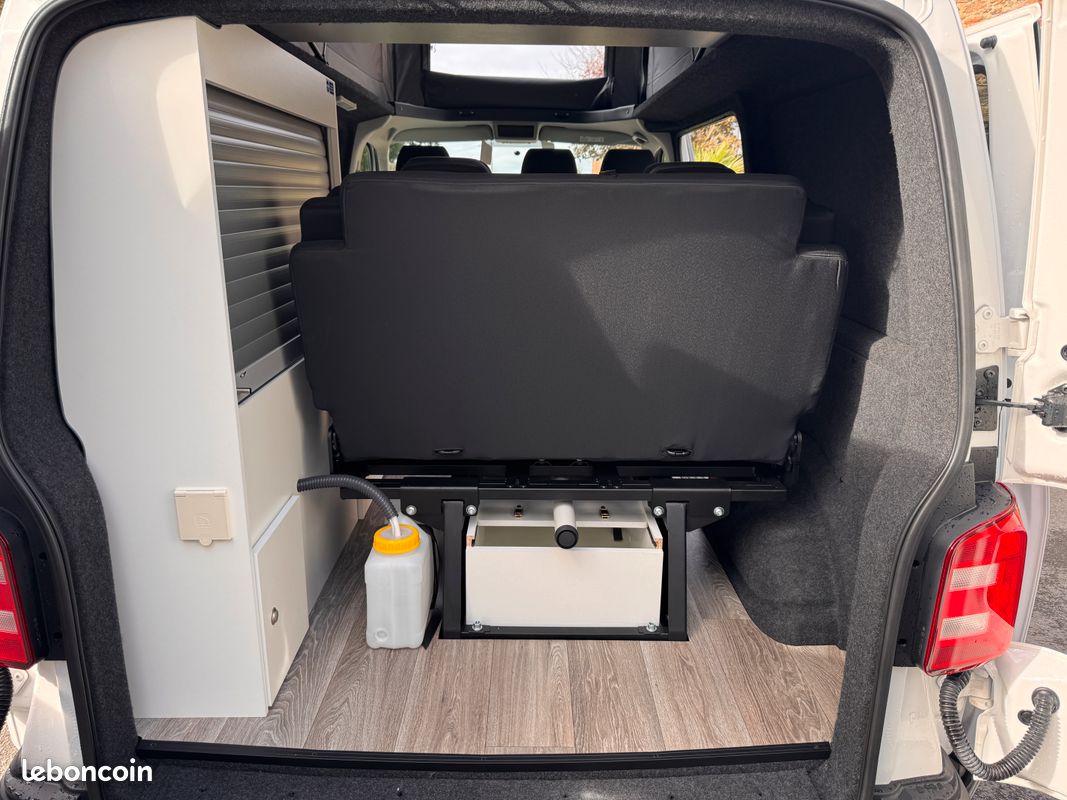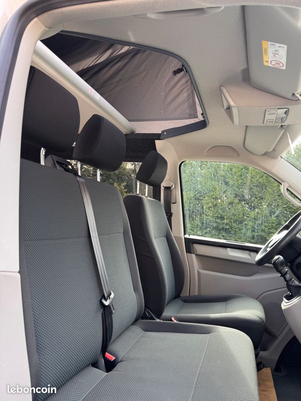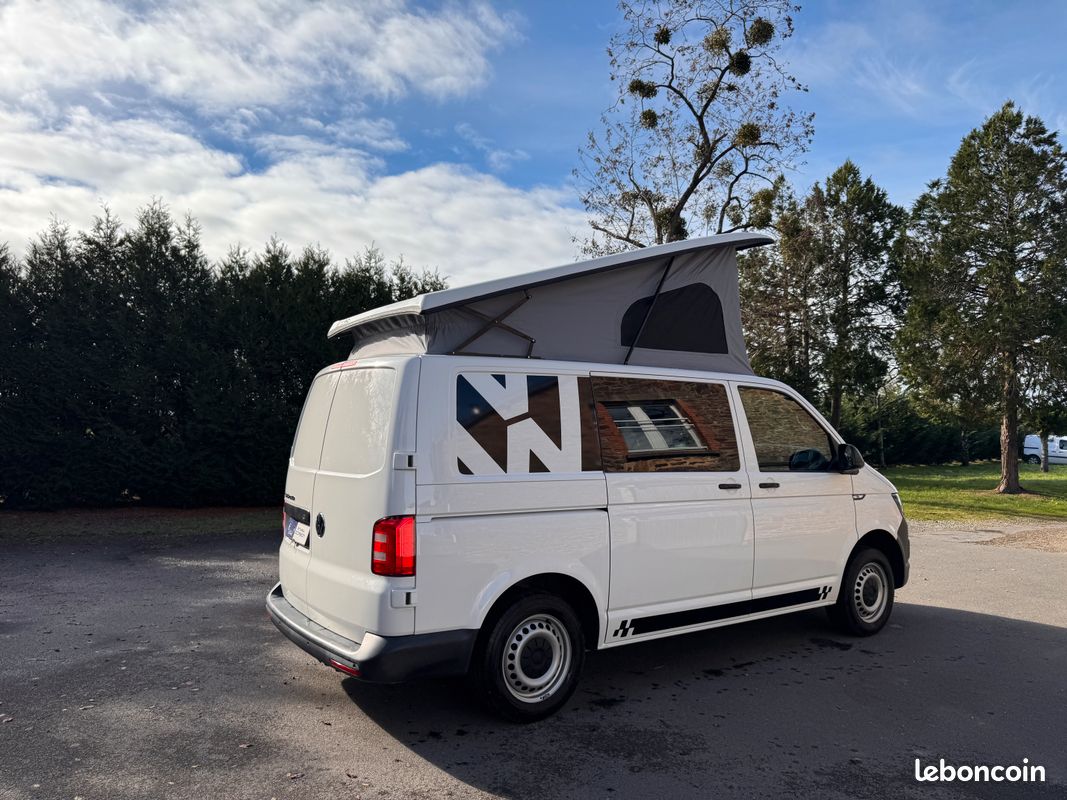 Ce T6 de 2019 est équipé d'un aménagement intérieur neuf et complet : toit relevable Reimo, cuisine, frigo Dometic, 4 couchages. Homologué VASP 5 places, prêt à prendre la route.
